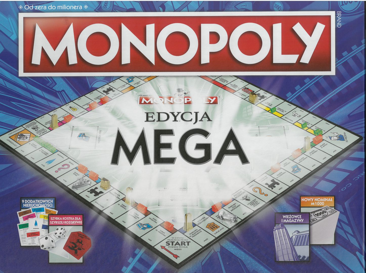 "Jeśli umiesz już grać w klasyczną wersję „Monopoly”, to nowe zasady poznasz w zaledwie kilka minut i błyskawicznie rozpoczniesz grę, która przeniesie Cię na zupełnie nowy poziom zabawy! Zdobądź więcej! Ogromna plansza to aż 12 dodatkowych pól (z czego 8 ulic) reprezentujących najbardziej rozpoznawalne i atrakcyjne miejsca w Polsce. Zacznij od Torunia, odwiedź koniecznie Trójmiasto i Wrocław, a może uda Ci się wykupić ostatnie miejsce na planszy – Krakowskie Przedmieście w Warszawie? Buduj wyżej! Gdy już zdobędziesz wymarzone pola, możesz budować na nich domy i hotele – ale to nie wszystko! W „Monopoly. Edycja Mega” sięgniesz samych chmur dzięki wieżowcom i ich niebotycznym czynszom, a wartość twoich dworców kolejowych podwoją magazyny! Zasady gry Monopoly Mega W swojej kolejce rzuć trzema kostkami: dwiema zwykłymi i specjalną „szybką kostką”, co pozwoli ci natychmiast przenieść się i kupić nową nieruchomość albo odwiedzić własną! Podczas rozgrywki zbieraj bilety autobusowe, aby poruszać się jeszcze szybciej, docierać do nieruchomości, które masz na oku i unikać tych, na których trzeba zapłacić czynsz! Nawet z tymi nowymi zasadami rozgrywka Monopoly Mega jest dynamiczna i zabawna, wciąż bliska klasycznej grze, ale niosąca nowe możliwości i emocje." [Bonito]