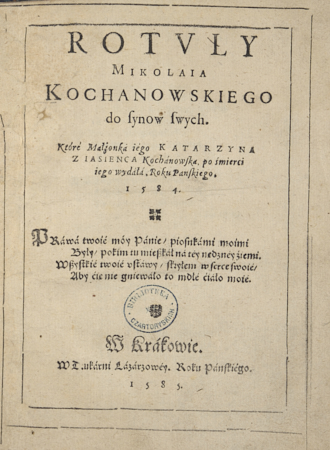 | Wydawcy: | W Drukarni Lazarzowey (1585) Katarzyna Kochanowska |