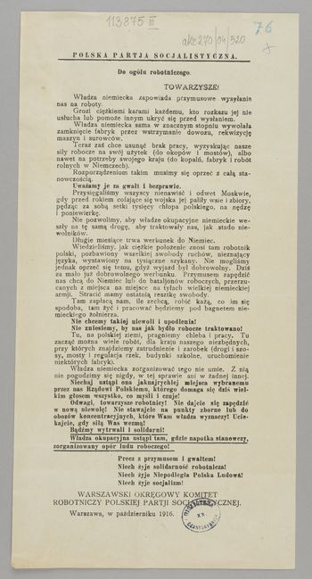 | Inne tytuły: | Towarzysze! Władza niemiecka zapowiada przymusowe wysyłanie nas na roboty ... |
