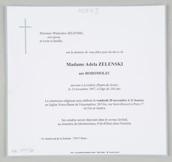 [Nekrolog. Incipit] Monsieur Wladyslaw Zelenski, son époux [...] Madame Adela Zelenski née Bohomolec, [...]