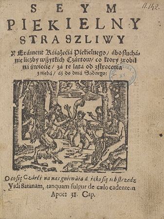 Seym Piekielny Straszliwy Y Exament Kśiążęćia Piekielnego, abo słuchanie licźby wszystkich Czartow, co ktory zrobił na świecie, za te lata od strącenia z nieba, aż do dnia Sądnego: O co się Czarći na nas gniewaią, a iako się ich strzedz Vidi Satanam tanquam fulgur de coelo cadentem Apoc. 13 Cap
