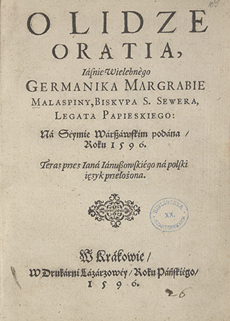 O Lidze Oratia, Iaśnie Wielebnègo Germanika Margrabie Malaspiny, Biskupa S. Sewera, legata papieskiego: Na Séymie Wárszáwskim podána Roku 1596