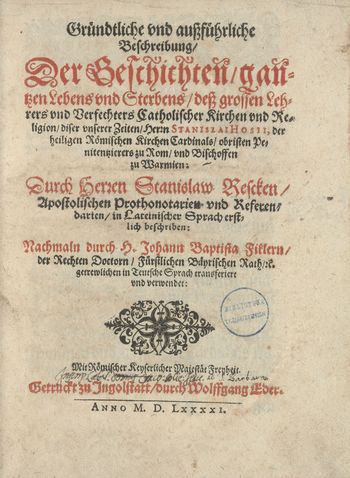 Gründtliche und aussführliche Beschreibung der Geschichten gantzen Lebens und Sterbens dess grossen Lehrers und Verfechters Catholischer Kirchen und Religion diser unserer Zeiten Herrn Stanislai Hosii, der heiligen Römischen Kirchen Cardinals obristen Penitentzierers zu Rom und Bischoffen zu Warmien