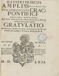 Illvstri Principi Ampliss: Diis Hominibvs[que] Approbantibvs, Crac: Pontifici Philippo Padnievio Regni Poloniæ Procancellario, Primum Cracouiam ingresso. Gratvlatio Ioanni, Mag: Ioan: Ociessii, Regni Cancellarii Filio, Dedicata