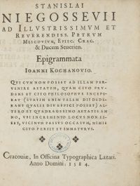 Ad Illustrissimum et reverendiss. Petrum Miscovivum, Episc. Crac. & Ducem Seuerien. Epigrammata Ioanni Kochanovio. qui cum non posset ad illiam pervenire aetatem, quam cito prudens et cito philosophus inceperat (statim enim talem dii dederant qualis div efici posset) altero et quadragesimo aetatis anno, ubi incremento locus non esset, vicinum passus accasum, nimis cito periit et immaturus