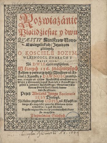 Rozwiązánie Piąćidźiesiąt y dwu Qvæstiy Ministrow Nowo-Ewangelickich Jezuitom zádánych O Kosciele Bozym, Wlasnosci, Znakach y Navce Iego, Ná Dwie częśći rozdźielone [...] Przez Adrianá Junge [...] Na końcu przydány Odpis, na Ksiąszki iednego Ewángelika, przeciw Obrázom chrześćijańskim, tegosz Auctorá [...]