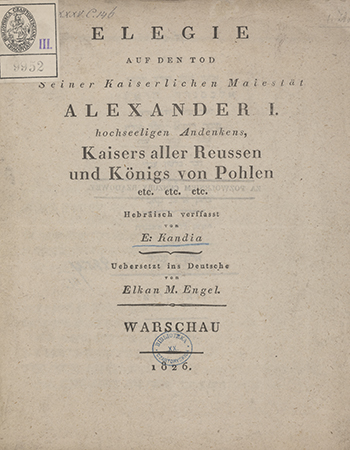 Elegie auf den Tod Seiner Keiserlichen Maiestaet Alexander I hochseeligen Andenkens, Kaisers Allen Russen und Köenigs von Pohlen etc. etc. etc. Hebräisch verffasst von…