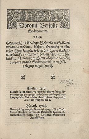 To iest, Odpowiedź na Apologią Jezuicką w Krakowie niedawno wydaną. Kthora odpowiedź w Pirwszey Cżęści zamyka w sobie dziesięcioro Kazań, naprzeciwko sześciorgom Kazań Apologiey Jezuickiej. A w drugiey Cżęści okazanie dowodne y obronę prawd Ewanyelickich w teyże Apologiey naganionych