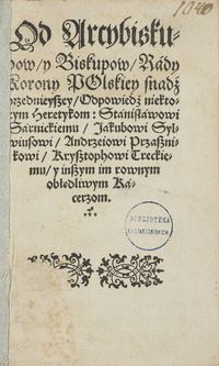 Arcybiskupów, (Od) y biskupow, Rady Korony Polskiey snadż przednieyszey,odpowiedż niektórym heretykom: Stanisławowi Sarnickiemu, Jakubowi Sylwiusowi, Andrzejowi Przasznikowi, Krysztofowi Treckiemu, y inszym im rownym obłędliwym kacerzom