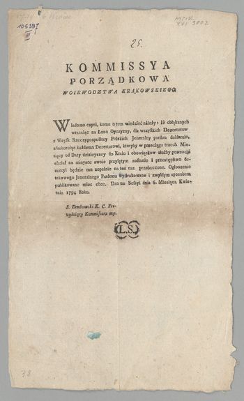 | Inne tytuły: | Wiadomo czyni [...] Dan na sessyi dnia 6. kwietnia 1794 roku Komisja Porządkowa Województwa Krakowskiego |