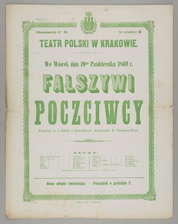 we wtorek dnia 19go października 1869 r. Fałszywi poczciwcy: komedya w 4 aktach z francuskiego, tłumaczenie M. Chrzanowskiego