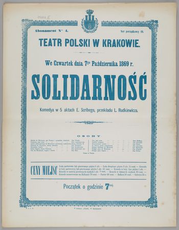 | Inne tytuły: | Komedya w 5 aktach E. Scribego, przekładu L. Rudkiewicza we czwartek dnia 7go października 1869 r. Solidarność |
