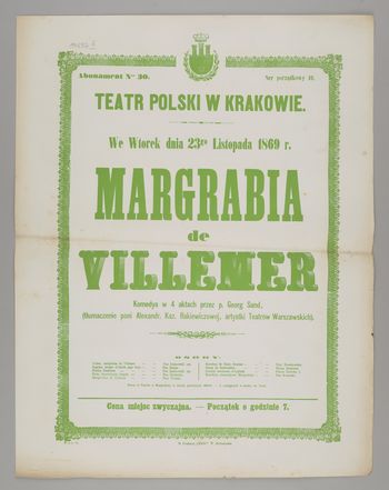 | Inne tytuły: | Komedya w 4 aktach przez p. George Sand, (tłumaczenie pani Alexandr. Kaz. Rakiewiczowej, artystki Teatrów Warszawskich) we wtorek dnia 23go listopada 1869 r. Margrabia de Villemer |