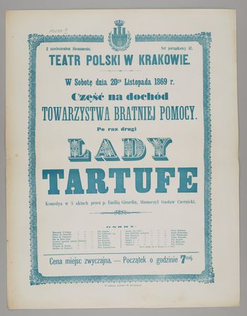| Inne tytuły: | Komedya w 5 aktach przez p. Emilią Girardin, tłumaczył Gustaw Czernicki w sobotę dnia 20go listopada 1869 r. Część na dochód Towarzystwa Bratniej Pomocy. Po raz drugi Lady Tartuff |