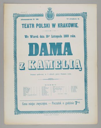 | Inne tytuły: | dramat społeczny w 5 aktach przez Dumasa syna we wtorek dnia 16go listopada 1869 r. Dama z kamelią |