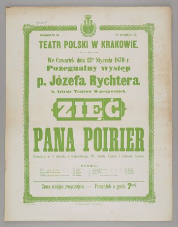 | Inne tytuły: | komedya w 3 aktach, z francuskiego PP. Emila Augier i Juliusza Sardou we czwartek dnia 13go stycznia 1870 r. Pożegnalny występ p. Józefa Rychtera b. Artysty Teatrów Warszawskich Zięć Pana Poirier |