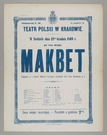 | Inne tytuły: | tragedya w 5 aktach Wiliama Szekspira, przekładu And. Edw. Koźmiana, p.t w niedzielę dnia 12go grudnia 1869 r. po raz drugi: Makbet |