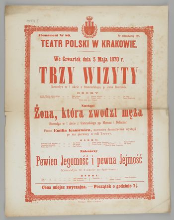 | Inne tytuły: | Un Monsieur et une Dame comédie en 1 acte (pol.) Trzy wizyty komedya w 1 akcie z francuskiego, p. Jana Bourdois we czwartek dnia 5go maja 1870 r. La femme, qui trompe son mari comédie-vaudeville (pol.) En Trois visites vaudeville en 1 acte (pol.) |