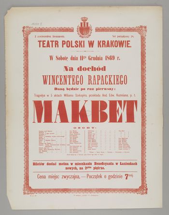 w sobotę dnia 11go grudnia 1869 r. Na dochód Wincentego Rapackiego daną będzie po raz pierwszy: tragedya w 5 aktach Wiliama Szekspira, przekładu And. Edw. Koźmiana, p.t. Makbet