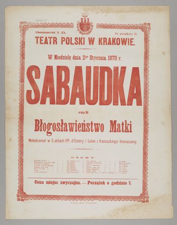 | Inne tytuły: | melodramat w 5 aktach PP. d'Emery i Leine z francuskiego tłumaczony w niedzielę dnia 2go stycznia 1870 r. Sabaudka czyli błogosławieństwo matki |