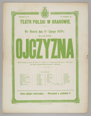 | Inne tytuły: | dramat historyczny przez W.Sardou w 5 aktach a w 7 obrazach, przetłumaczył z francuskiego i dla Sceny Krakowskiej ułożył Wincenty hr. Bobrowski we wtorek dnia 8go lutego 1870 r. po raz trzeci Ojczyzna |