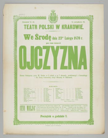 | Inne tytuły: | dramat historyczny przez W.Sardou w 5 aktach a w 7 obrazach, przetłumaczył z francuskiego i dla Sceny Krakowskiej ułożył Wincenty hr. Bobrowski we środę dnia 23go lutego 1870 r. po raz trzeci Ojczyzna |