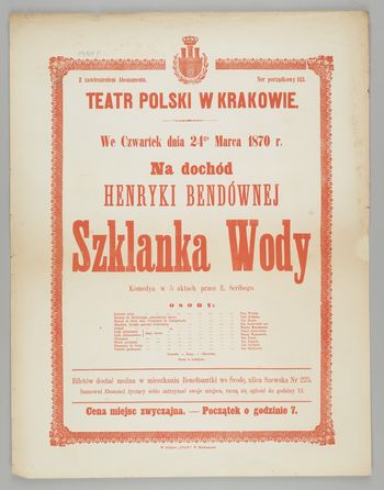 | Inne tytuły: | Komewdya w 5 akatach przez E. Scribego we czwartek dnia 24go marca 1870 r. Na dochód Henryki Bendównej Szklanka wody |
