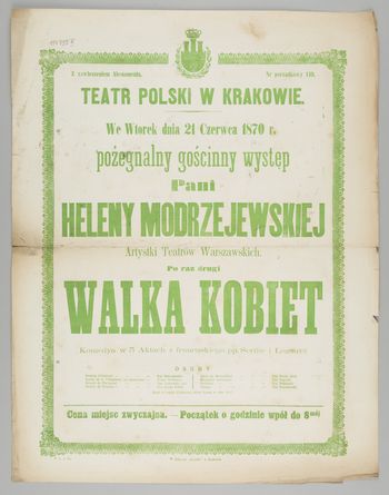 | Inne tytuły: | komedya w 3 aktach z francuskiego pp. Scribe i Legouvé pożegnalny gościnny występ Pani Heleny Modrzejewskiej Artystki Teatrów Warszawskich po raz drugi Walka kobiet |
