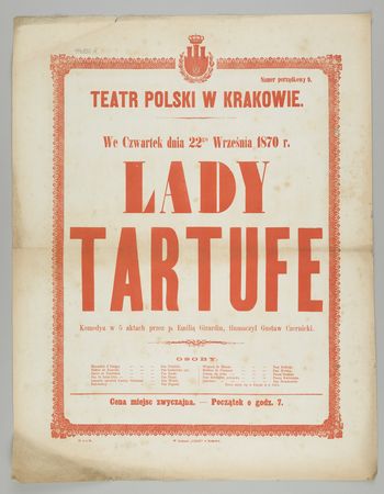 | Inne tytuły: | Komedya w 5 aktach przez p. Emilią Girardin, tłumaczył Gustaw Czernicki Lady Tartuff |