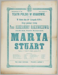 | Inne tytuły: | drugi gościnny występ Pani Aleksandry Rakiewiczowej artystki dram. Teatrów Warszawskich Marya Stuart tragedya w 5 aktach Fr. Szyllera, przełożył M.B |