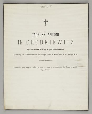 [Nekrolog. Incipit] Tadeusz Antoni Hr. Chodkiewicz były Marszałek Szlachty w gub. Mochilewskiej, [...]