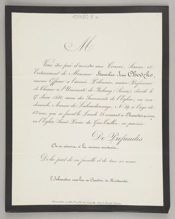 [Nekrolog. Incipit] M Vous êtes prié d'assister aux Convoi, [...] Monsieur Stanislas-Jean Chodzko, ancien Officier á l'armée Polonaise [...]
