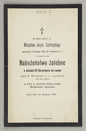 [Nekrolog. Incipit] Za spokój duszy ś. p. Władysława księcia Czartoryskiego [...]