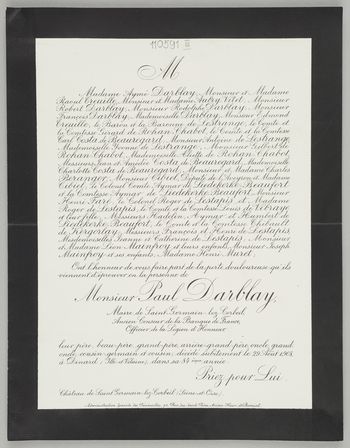 [Nekrolog. Incipit] M Madame Aymé Darblay [...] Monsieur Paul Darblay Maire de Saint-Germain-les-Corbeil [...]