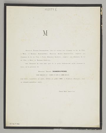 [Nekrolog. Incipit] M Monsieur Thomas Dombrowski, [...] Monsieur Thadée Dombrowski, Ancien Commandant au 1er Régiment de Ligne de l'Armée Polonaise, leur frère [...]