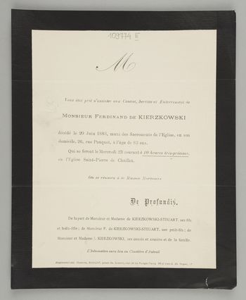 [Nekrolog. Incipit] Vous êtes prié d'assister aux Convoi [...] Monsieur Ferdinand de Kierzkowski, [...]