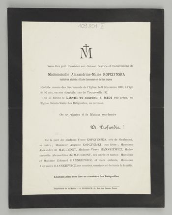 [Nekrolog. Incipit] M Vous êtes prié d'assister aux Convoi[...] Mademoiselle Alexandrine-Marie Kopczynska Institutrice adjointe à l'Ecole Communale de la Rue Ampère, [...]