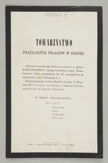 [Nekrolog. Incipit] Towarzystwo Pracujących Polaków w Paryżu zaprasza Szanownego Pana na pogrzeb ś. p. Adama Kozłowskiego, byłego sekretarza tegoż Towarzystwa [...]