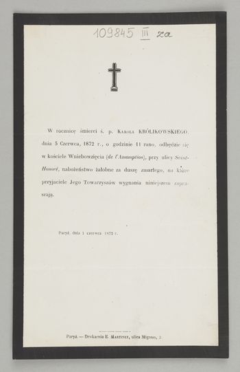 [Nekrolog. Incipit] W rocznicę śmierci ś. p. Karola Królikowskiego, [...]