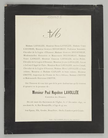 [Nekrolog. Incipit] M Madame Lavollée, Monsieur Henri Lavollée [...] Monsieur paul Napoléon Lavollée Controleur des Douanes [...]
