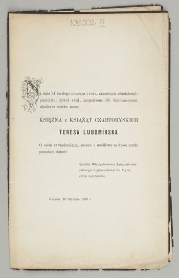 [Nekrolog. Incipit] Na dniu 31 zeszłego miesiąca i roku, zakończyła osiemdziesiątpięcioletni [!] żywot swój [...] Księżna z Książąt Czartoryskich Teresa Lubomirska [...]