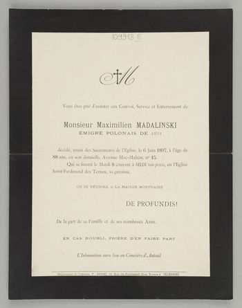 [Nekrolog. Incipit] M Vous êtes prié d'assister aux Convoi [...] Monsieur Maximilien Madalinski Émigré Polonais de 1831 [...]
