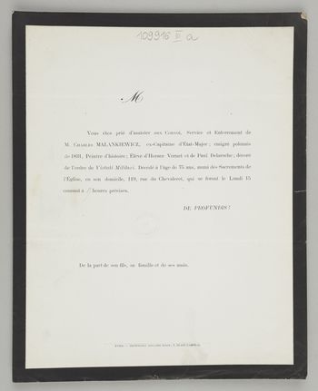 [Nekrolog. Incipit] M Vous êtes prié d'assister aux Convoi [...] M. Charles Malankiewicz, ex-Capitaine d'État-Major [...]
