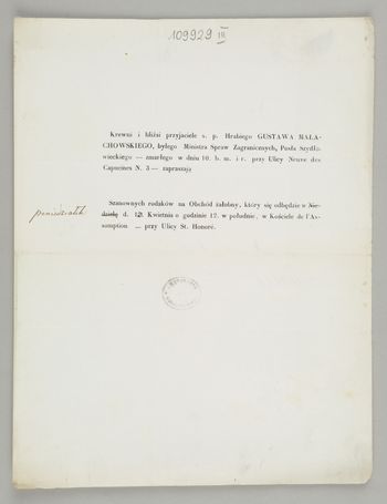[Nekrolog. Incipit] Krewni i bliżsi przyjaciele ś. p. Hrabiego Gustawa Małachowskiego, byłego Ministra Spraw Zagranicznych, [...]