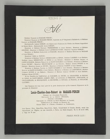 [Nekrolog. Incipit] Madame Charles de Mazade-Percin, [...] Monsieur Louis-Charles-Jean-Robert de Mazade-Percin membre de l'Académie Française [...]