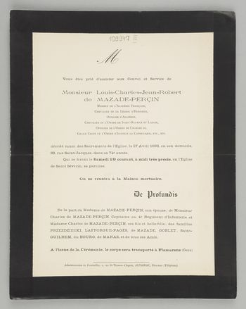 [Nekrolog. Incipit] M Vous êtes prié d'assister aux Convoi et [...] Monsieur Louis-Charles-Jean-Robert de Mazade-Percin Membre de l'Académie Française [...]