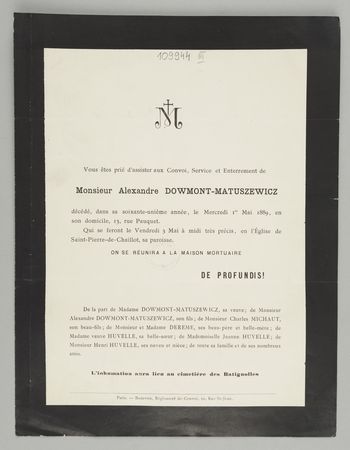 [Nekrolog. Incipit] M Vous êtes prié d'assister aux Convoi [...] Monsieur Alexandre Dowmont-Matuszewicz [...]