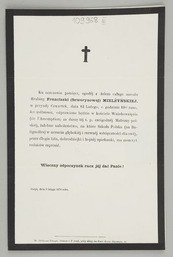 [Nekrolog. Incipit] Ku uczczeniu pamięci, [...] Hrabiny Franciszki (Sewerynowej) Mielżyńskiej, [...]