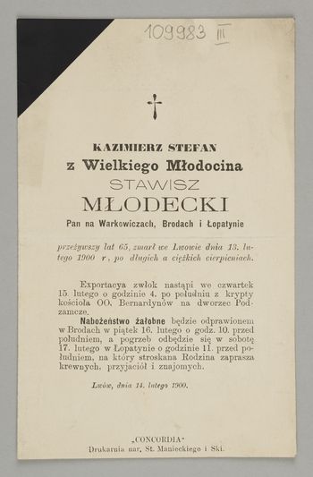 [Nekrolog. Incipit] Kazimierz Stefan z Wielkiego Młodocina Stawisz Młodecki Pan na Warkowiczach, Brodach i Łopatynie [...]