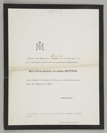 [Nekrolog. Incipit] M Madame veuve Mostowska a l'honneur, [...] Mademoiselle Marie-Thérèse-Antoinette, née comtesse Mostowska sa fille [...]